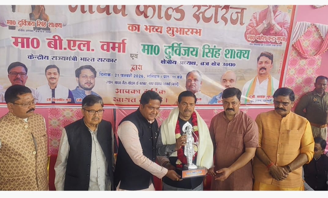 बदायूँ सहसबान-केंद्रीय राज्य मंत्री बीएल वर्मा ने आज दंहगबा में पहुंचकर माधव कोल्ड स्टोरेज का फीता काटकर उद्घाटन किया मुख्य अतिथि के रूप में पहुंचे बीएल वर्मा का नरेश गुप्ता, मयंक गुप्ता, विश्वजीत गुप्ता, माधव गुप्ता, सहित अन्य लोगों ने फूल मालाओं के साथ जोरदार स्वागत किया। उद्घाटन समारोह को संबोधित करते हुए कहा की क्षेत्र के किसान लंबे समय से आधुनिक भंडारण केंद्र की मांग कर रहे थे। अब आलू सहित अन्य कृषि उत्पादों को नियंत्रित तापमान में लंबे समय तक संरक्षित रखा जा सकेगा इससे न केवल फसलों की बर्बादी रुकेगी बल्कि किसानों को बाजार में सही समय पर बेहतर दाम भी मिल सकेंगे उन्होंने जोर देकर कहा कि कृषि क्षेत्र की मजबूती ही ग्रामीण अर्थव्यवस्था की असली बुनियाद है, समारोह में पहुंचे सदर विधायक महेश चंद्र गुप्ता ने कहा कि यह कोल्ड स्टोरेज आसपास के इलाकों के विकास में मिल का पत्थर साबित होगा स्थानीय स्तर पर यह सुविधा उपलब्ध होने से किसानों की परिवहन लागत घटेगी और उनकी शुद्ध आमदनी में इजाफा होगा इंजीनियर मयंक गुप्ता ने भी इस क्षेत्र की बड़ी जरूरत बताते हुए कहा कि अब किसान बेहतर बाजार रणनीति अपना सकेंगे । इस मौके पर केंद्रीय राज्य मंत्री बीएल वर्मा सदर विधायक महेश चंद्र गुप्ता, नरेश गुप्ता, भाजपा नेता विश्वजीत गुप्ता, युवा नेता मयंक गुप्ता, माधव गुप्ता सहित सैकड़ो की तादाद में लोग मौजूद रहे।
