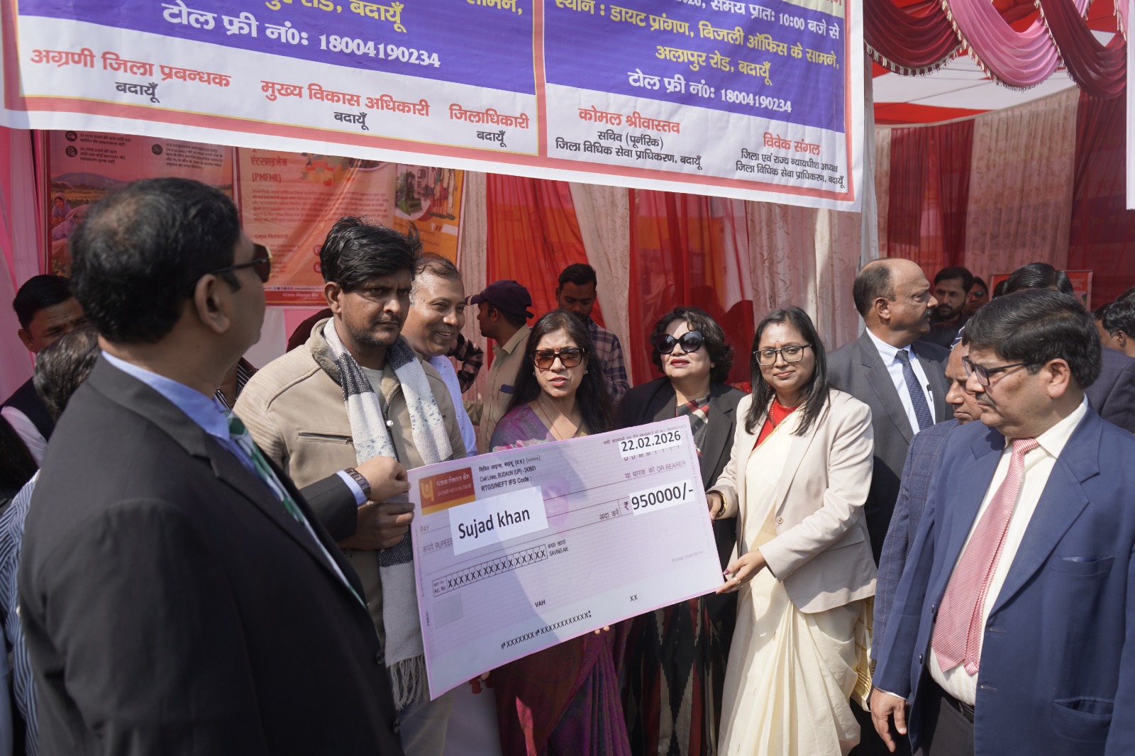 मेगा/बृहद विधिक सहायता एवं सेवा शिविर में कस्तूरबा गांधी बालिका विद्यालय म्याऊ, बदायूँ की छात्राओं द्वारा नुक्कड नाटक/नृत्य प्रस्तुत किया गया एवं राजकीय महाविद्यालय की छात्राओं द्वारा मिशन शक्ति महिला सशक्तिकरण के विषय पर भाषण प्रस्तुत किया गया। इसी क्रम में बाल विकास परियोजना अधिकारी के सौजन्य से 05 महिला लाभार्थियों की गोद भराई एवं 02 बच्चों का अन्नप्राशन की रश्म, दिव्यांगजन विभाग के अधिकारी के सौजन्य से दिव्यांगजनों को 05 ट्राई साइकिल एवं 05 श्रवण यन्त्रों, जिला परियोजना अधिकारी के सौजन्य से 02 लाभार्थियों को योजना से लाभान्वित करने का प्रमाण पत्र, जिला ग्रामोद्योग अधिकारी के सौजन्य से 02 लाभार्थियों को पापकॉर्न मशीन एवं उ०प्र० राज्य आजीविका ग्रामीण मिशन, बदायूँ के सौजन्य से 05 लाभार्थियों को चैक श्री विवेक संगल, जनपद न्यायाधीश/अध्यक्ष, जिला विधिक सेवा प्राधिकरण, बदायू, श्री बलजोर रािह, प्रधान न्यायाधश, कुटुम्ब, न्यायालय, बदायूँ, श्री वीर कनेडी लाल मोटर दुर्घटना दावा अधिकरण, बदायूँ, श्री धमेन्द्र कुमार जायसवाल, अध्यक्ष स्थाई लोक अदालत बदायूँ, मेगा शिविर समिति की अध्यक्षा सुश्री रिन्कू जिन्दल, प्रथम अपर जिला एवं सत्र न्यायाधीश बदायूँ के माध्यम से वितरण किया गया एवं अन्य विभागों के माध्यम से उक्त मेगा शिविर में कुल 719 लोगों चिन्हित एव पंजीकृत किया गया एवं 403 लाभार्थियों को लाभ प्रदान किया गया।