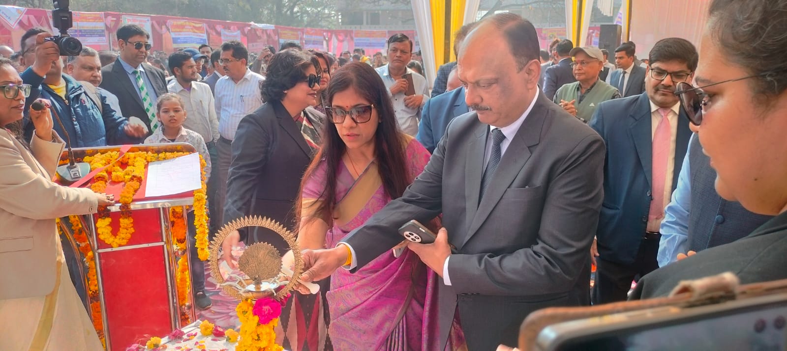 मेगा/बृहद विधिक सहायता एवं सेवा शिविर का शुभारम्भ श्री विवेक संगल, जनपद न्यायाधीश/अध्यक्ष, जिला विधिक सेवा प्राधिकरण, बदायूं एवं उनकी धर्मपत्नी श्रीमती शालू संगल, श्री बलजोर सिंह, प्रधान न्यायाधीश, कुटुम्ब, न्यायालय, बदायूँ, श्री वीर कनेडी लाल, मोटर दुर्घटना दाबा अधिकरण, बदायूँ, श्री धर्मेन्द्र कुमार जायसवाल, अध्यक्ष, स्थाई लोक अदालत बदायूँ मेगा शिविर समिति की अध्यक्षा सुश्री रिन्कू जिन्दल, प्रथम अपर जिला एवं सत्र न्यायाधीश, बदायूँ द्वारा डाइट परिसर, बदायूँ में दीप प्रज्जवलित करके किया गया।