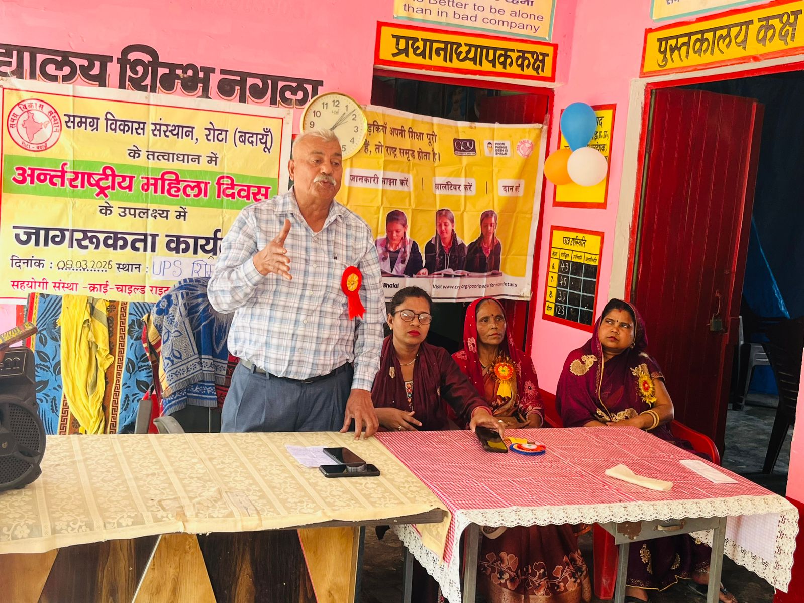 बदायूँ आज दिनांक 8.3.2026 को जनपद बदायूं के ब्लॉक उसावां के ग्राम शिम्भू नगला के उच्च प्राथमिक विद्यालय में समग्र विकास संस्थान के तत्वावधान में क्राई- चाइल्ड राइट्स एंड यू के सहयोग से अंतर्राष्ट्रीय महिला दिवस कार्यक्रम का आयोजन किया गया! कार्यक्रम की शुरुआत में मुख्य अतिथि के रूप में उपस्थित संस्था की गर्वनिंग बॉडी की सदस्य श्रीमती सुखदेवी जी , विशिष्ट अतिथि के रूप मे उपस्थित श्रीमती कमलेश (आंगनबाडी कार्यकत्री ) , विद्यालय की प्रधान अध्यापक श्री नजीम जी तथा कार्यक्रम की अध्यक्षता कर रहे संस्था के अध्यक्ष श्री राजकुमार शर्मा जी का सर्वप्रथम बैज पहनाकर स्वागत किया गया! कार्यक्रम में मुख्य अतिथि के रूप में उपस्थित श्रीमती सुखदेवी जी ने उपस्थित सदस्यों के साथ जानकारी देते हुए बताया कि जन्म से लेकर और मृत्यु तक का जीवन औरत दूसरों के लिए समर्पित कर देती है, उसकी अपनी पहचान कहीं ना कहीं दबी रह जाती है! पहले वह किसी की मां फिर किसी की पत्नी, फिर किसी की बहू तथा अंत में किसी की दादी और नानी के नाम से जानी जाती है! महिला को अपनी पहचान बनाने के लिए आत्मनिर्भर होना अत्यंत आवश्यक है जिसके लिए शिक्षा एकमात्र माध्यम है! कार्यक्रम की अध्यक्षता कर रहे हैं श्री राजकुमार शर्मा जी ने समाज में महिला और पुरुष को समान दर्जा देने के बारे में बताया कि आज के दिन अंतर्राष्ट्रीय महिला दिवस मनाने की आवश्यकता क्यों पड़ी जिसका कारण है कि प्राचीन समय में महिला श्रमिकों को कार्य के घंटे के आधार पर वेतन नहीं दिया जाता था, महिलाओं को वोट डालने का अधिकार नहीं था! अपने इन्हीं अधिकारों को लेने के लिए महिला श्रमिकों ने एक मुहिम शुरू की जिसे अंतरराष्ट्रीय स्तर पर प्रोत्साहित किया गया और उस दिन को अंतर्राष्ट्रीय महिला दिवस के रूप में मनाया जाने लगा! संस्था की साथी बुशरा ने उपस्थित सभी सदस्यों को महिला अंतर्राष्ट्रीय महिला दिवस मनाए जाने के कारण के इतिहास पर विस्तार पूर्वक अपनी जानकारी साझा की! कार्यक्रम में उपस्थित संस्था कार्यकत्री पिंकी जी ने घरेलू हिंसा पर बात करते हुए महिलाओं को अपने हक व अधिकारों के प्रति जागरूक होने के बारे में बताया तथा घर,परिवार में होने वाली सामाजिक, मानसिक भावनात्मक तथा शारीरिक हिंसा के खिलाफ आवाज उठाने को लेकर प्रेरित किया! अगले क्रम में संस्था टीम से श्रीमती नवनीत जी ने दहेज प्रथा कानून पर जानकारी देते हुए बताया कि इस कानून के तहत 5 वर्ष की सजा व 15000 रूपये तक का जुर्माना है इसलिए ना ही कोई सदस्य दहेज लेने की मांग करें और ना ही कोई सदस्य अपनी तरफ से दहेज देने का प्रोत्साहन करें। कार्यक्रम को आगे बढ़ाते हुए संस्था की सदस्य कु०अंकना ने बाल विवाह पर जानकारी देते हुए बताया कि बाल विवाह प्