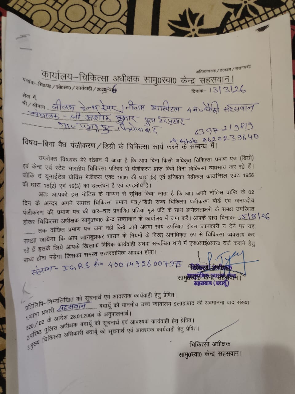 बदायूँ सहसवान स्वास्थ्य विभाग की नाक के नीचे मरीजों की जिंदगी से खिलवाड़ कर रहे अवैध अस्पताल ओपन प्रशासन ने शिकंजा कसना शुरू कर दिया है, ताजा ही मामला नगर के चार नंबर चुंगी स्थित नीलम हॉस्पिटल का है, जहां बिना किसी अवैध डिग्री और पंजीकरण के धड़ले से मरीजों का इलाज किया जा रहा था सामुदायिक स्वास्थ्य केंद्र CHC सहसवान के चिकित्सा अधीक्षक ने अस्पताल संचालक को नोटिस जारी कर 48 घंटे का अल्टीमेटम दिया है, नियमों की उड़ी जरिया कानून का खौफ नहीं शिकायत के बाद सामने आया कि अस्पताल संचालक अशोक कुमार निवासी ग्राम पहाड़पुर फिरोजाबाद के पास ना तो कोई अधिकृत चिकित्सा डिग्री है, और ना ही राज्य केंद्र परिषद का पंजीकरण है। सीधे तौर पर यूनानईटेड प्रोविंस मेडिकल एक्ट 1939 और इंडियन मेडिकल काउंसिल एक्ट 1956 की धाराओं का खुला उल्लंघन है, बिना मानकों के संचालित इस केंद्र पर गंभीर मरीजों के साथ रिक्स लिया जा रहा है और मरीजों की सर्जरी कराई जा रही है। चिकित्सा अधीक्षक ने स्पष्ट चेतावनी दी है 15 मार्च तक सभी मूल प्रमाण पत्रों के प्रमाण प्रतियां प्रस्तुत करनी होगी साक्ष्य ना मिलने पर इसे अवैध चिकित्सा व्यवसाय मानते हुए संबंधित थाने में FIR दर्ज कराई जाएगी। इस अवैध नेटवर्क और मिलीभगत की चर्चा आम है। की स्वास्थ्य विभाग के कुछ निचले स्तर के कर्मियों की मिली भगत से क्षेत्र में ऐसे कई यमराज सक्रिय हैं,जो बिना आपातकालीन सुविधाओं और मानकों के चल रहे हैं। ये अस्पताल केवल पैसा कमाने की मशीन बन चुके हैं क्षेत्रवासियों ने मांग की है कि केवल नोटिस तक सीमित न रहकर इन पर स्थाई रूप से ताला लगाया जाना चाहिए। किसी भी झोलाछाप या अस्पताल को जनता की जान से खेलने की अनुमति नहीं दी जानी चाहिए नीलम हॉस्पिटल को नोटिस जारी कर दिया गया है, समय सीमा के भीतर दस्तावेज न मिलने पर चिकित्सा प्रभारी ने कठोर कानूनी कार्रवाई करने की बात कही है।