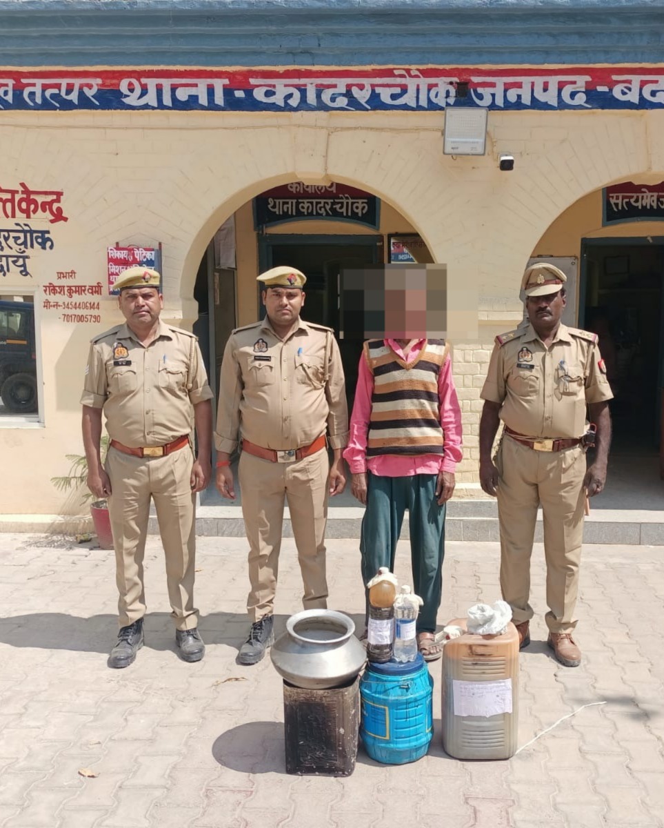 वरिष्ठ पुलिस अधीक्षक जनपद बदायूँ, सुश्री अंकिता शर्मा के आदेशानुसार एवं अपर पुलिस अधीक्षक नगर बदायूँ के निर्देशन एवं क्षेत्राधिकारी उझानी के पर्यवेक्षण में अवैध शराब की तस्करी करने वाले अभियुक्तो के विरुद्ध चलाए जा रहे अभियान के अन्तर्गत आज दिनांक 21.03.2026 को थाना कादरचौक पुलिस द्वारा मुखबिर की सूचना पर 01 अभियुक्त सूरजपाल पुत्र कल्यान सिंह निवासी ग्राम ककोडा थाना कादरचौक बदायूं को ग्राम ककोडा के जंगल से खेत पर बनी झोपडी से मय शराब बनाने के उपकरण व एक जरीकैन प्लास्टिक मे 20 लीटर शराब खाम सहित गिरफ्तार किया गया जिसके सम्बन्ध में थाना कादरचौक पर मु0अ0सं0 72/2026 धारा 60(2) Ex Act बनाम सूरजपाल उपरोक्त पंजीकृत किया गया । गिरफ्तार अभियुक्त को हिरासत पुलिस मे लेकर मा0 न्ययालय के समक्ष पेश किया गया।