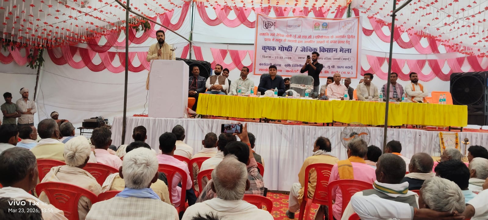 बदायूँ यूपी डास्प द्वारा सचांलित नमांमि गगें जैविक खेती परियोजना के अंतर्गत कृषक गोष्ठी /जैविक किसान मेलें का आयोजन विकास खण्ड परिसर उसावा जनपद बदायूँ में मा० विधायक प्रतिनिधि/ ब्लाक प्रमुख दातागंज श्री अतेन्द्र विक्रम सिहं जी की अध्यक्षता में कार्यदायी सस्थां वायोसर्ट इन्टर नेशनल द्वारा आयोजित किया गया जैविक किसान मेला में जिला परियोजना समन्वयक महोदय द्वारा रासानिक खेती से होने वाले दुष्प्रभाव के बारे में बताया गया एवं सहायक विकास अधिकारी कृषि उसावा द्वारा जैविक विधि से डीमक व फफूदींनाशक रोगों के रोकथाम के बारे में बताया गया एवं नमामि गगें के जिला प्रभारी लवकुश मिश्रा द्वारा जैविक विधि से फसल में पोषकतत्व प्रबंधन के बारे में बताया गया तथा डा० आर एस सिहं द्वारा जैविक फसल में रोग व कीट नियंत्रण के बारे में वताया गया साथ ही ब्लाक प्रमुख अतेन्द्र विक्रम सिहं जी द्वारा किसानों जैविक खेती करने की अपील के जैविक के लाभों से अवगत कराया गया साथ ही जैविक खेती करने वालें कृषकों का पूर्ण सहयोग करने हेतु कहा गया जैविक किसान मेला में कृषि विभाग के सहायक विकास अधिकारी डा० गजेन्द्र सिहं जी वी टी एम उसावा पी पी एस उसावा प्रमाणीकरण सस्थां से अवदेश कुमार जी एवं सभी क्षेत्रीय एल आर पी और किसान उपस्थित रहे।