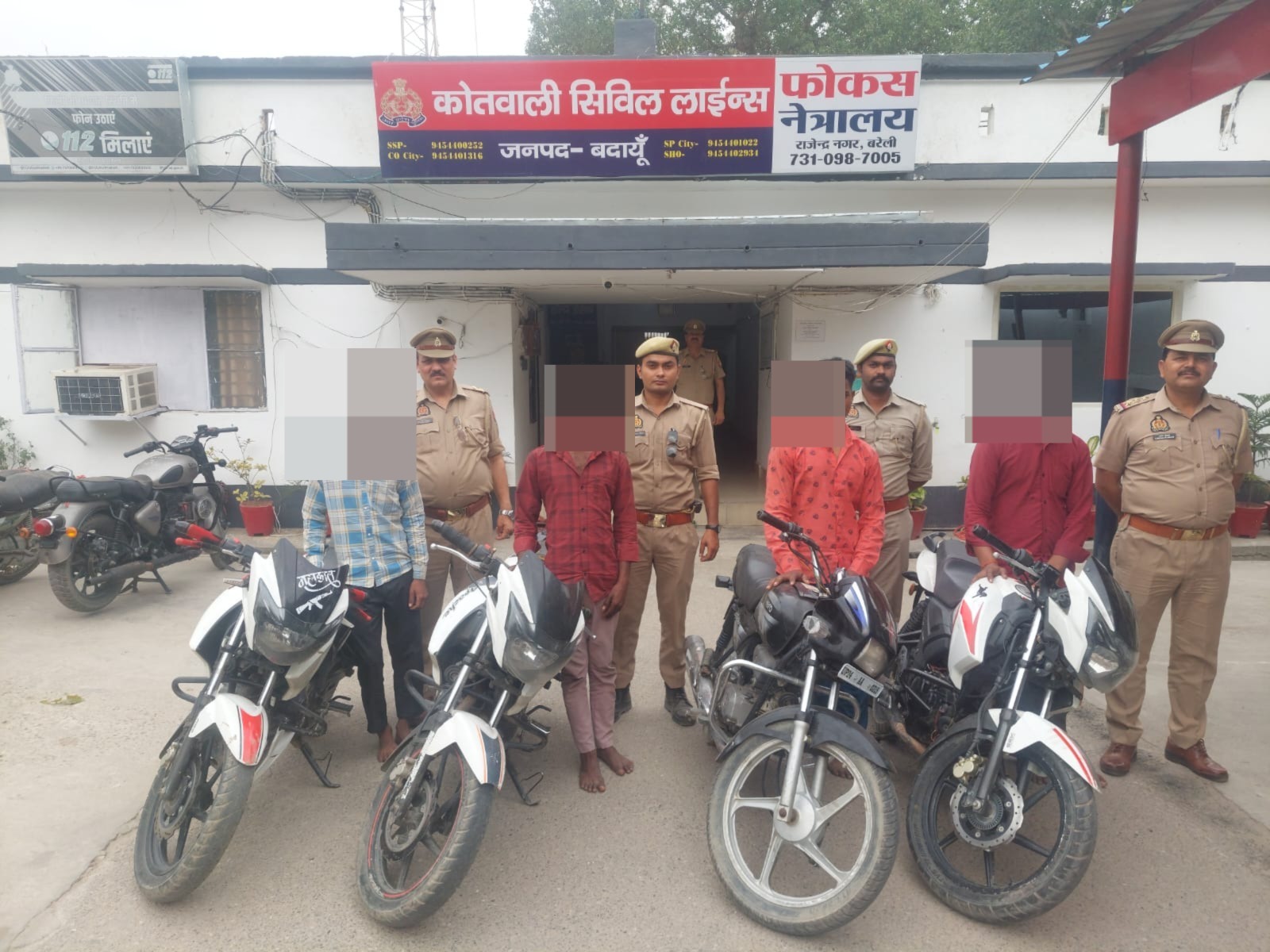 वरिष्ठ पुलिस अधीक्षक बदायूँ अंकिता शर्मा के निर्देशन में जनपद में चलाए जा रहे अपराध एवं अपराधियों के विरुद्ध गिरफ्तारी अभियान के अन्तर्गत आज दिनांक 27.03.2026 को संदिग्ध व्यक्ति व वाहन चैकिंग के दौरान थाना सिविल लाइन्स पुलिस द्वारा मुखबिर की सूचना पर 04 अभि0गण 1. गौरव पुत्र मुनीश निवासी कोल्हाई थाना दातांगज जिला बदायू 2.सूरज पुत्र कालीचरन निवासी कोल्हाई थाना दातांगज जिला बदायूँ 3.विजय पुत्र सुनील निवासी डहरपुर कलां थाना दातांगज जिला बदायू 4.अजय पुत्र सुनील निवासी डहरपुर कलां थाना दातांगज जिला बदायूँ को मय 1- अभियुक्त गौरव के कब्जे से 01 मोटरसाइकिल आपाची रंग सफेद बिना नम्बर प्लेट जिसका चेसिस नम्बर MD634KE44D2N49163 इंजन नम्बर OE4ND2539862, 2-अभियुक्त सूरज के कब्जे से मोटरसाइकिल आपाची रंग सफेद बिना नम्बर प्लेट जिसके आगे महाकाल लिखा जिसका चेसिस नम्बर MD634CE49K2C15989 इंजन नम्बर CE4CK2415347, 3- अभियुक्त विजय के कब्जे से एक मोटरसाईकिल स्पैलण्डर रंग काला रजिस्ट्रेशन नम्बर UP24AA0315 चेसिस नम्बर MBLHA10CGGHFB2921 तथा इंजन नम्बर HA10ERGHF72728 व 4- अभियुक्त अजय के कब्जे से एक मोटरसाईकिल आपाची रंग सफेद नम्बर UP13AL3783 चेसिस नम्बर MD634AE8XM2K11554 तथा इंजन नम्बर घीसा हुआ है, बरामद किया गया। जिसके संबंध में थाना सिविल लाइन्स पर मु0अ0सं0 0120/2026 धारा 318(4)/317(2)/317(5)/346 बीएनएस बनाम गौरव पुत्र मुनीश आदि 4 नफर उपरोक्त के पंजीकृत कर अभि0गण को माननीय न्यायालय के समक्ष पेश कर जेल भेजा गया ।